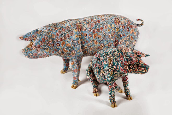 One of my favorite artists, Wim Delvoye (whose website is a piece of art by itself) creates extraordinary pieces by combining daily objects (car tires or concrete mixers) with Gothic and Baroque motives, crafts and architecture. Carpets did not evade from his creative mind as he made a series of Carpet Pigs sculptures out of oriental rugs.